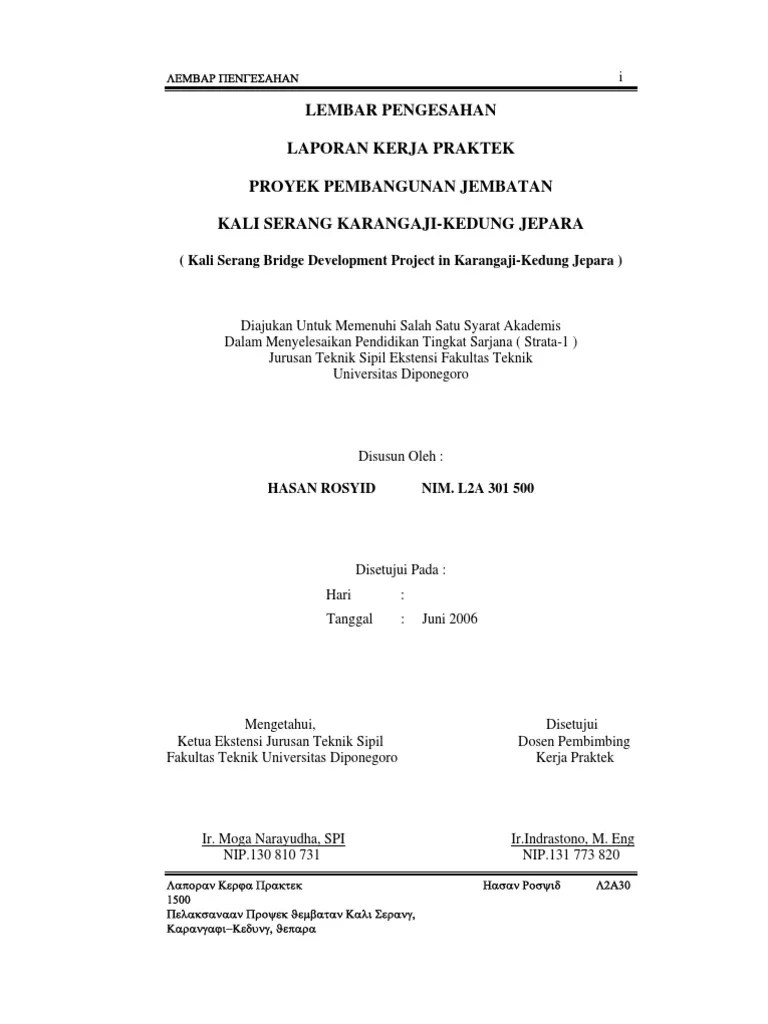 Contoh Laporan Kerja Praktek Jalan Tol - 2 : Meningkatkan kualitas kerja individu maupun institusi c.. Meningkatkan kepercayaan publik atau stakeholders b. Termasuk di dalamnya adalah pekerjaan umum seperti jalan raya, jembatan, dermaga, terowongan, kanal, waduk / bendungan, bandar udara, terminal, stasiun, sistem pembuangan, perpipaan, struktur bangunan … Contoh laporan sebagai bentuk akuntabilitas kinerja dalam lingkup birokrasi yaitu. Teknik sipil adalah suatu disiplin ilmu teknik yang berhubungan dengan desain, konstruksi dan pemeliharaan lingkungan yang dibangun secara fisik maupun alami. Pada paradigma apakah yang sudah mulai …